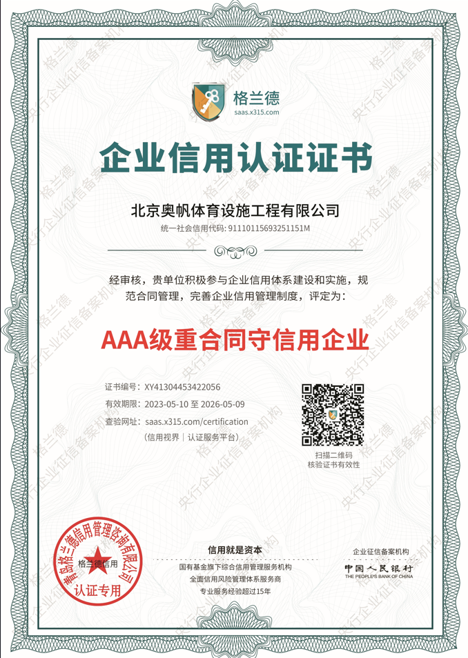 品牌和口碑是企业实力的重要体现。奥帆体育凭借17载的深耕,积累了良好的行业口碑与广泛认可。公司资质完备,已通过多项权威认证,包括职业健康安全管理体系、环境管理体系、质量管理体系认证等,还荣获了AAA级质量服务诚信单位、AAA级重合同守信用企业等多项荣誉。其产品检测全面达标,获专业机构认可。在客户案例方面,奥帆体育的业务版图遍布全国多个省份,累计完成数百个体育场地建设及改造项目,一次性验收合格率达98%以上,凭借过硬的工程品质赢得甲方一致好评。
